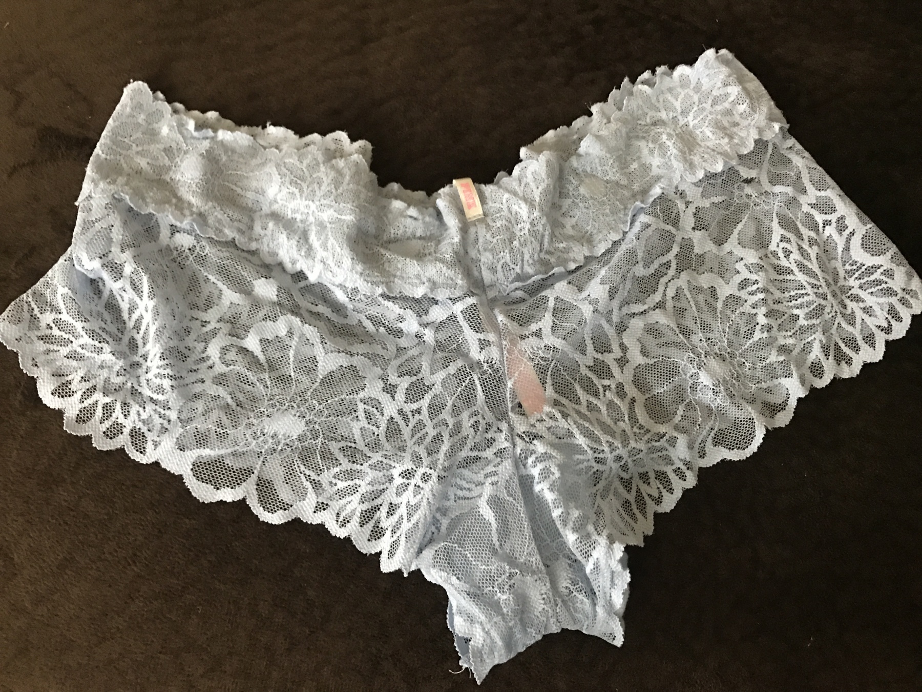Light blue, all lace, Victoria Secret panties. I am currently 8 months pregnant, will be worn for a full 24 hours before being shipped to you. :) Message me if you have any special requests!