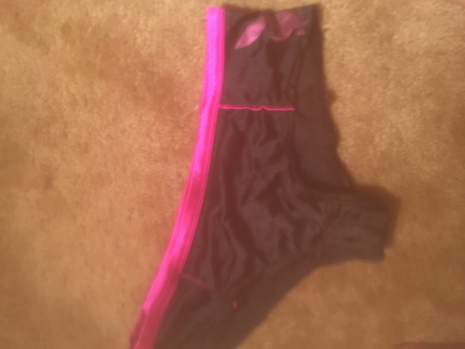 These sexy underwear are black with a pink outline, size small. The back has a V cut out with wholes for strings