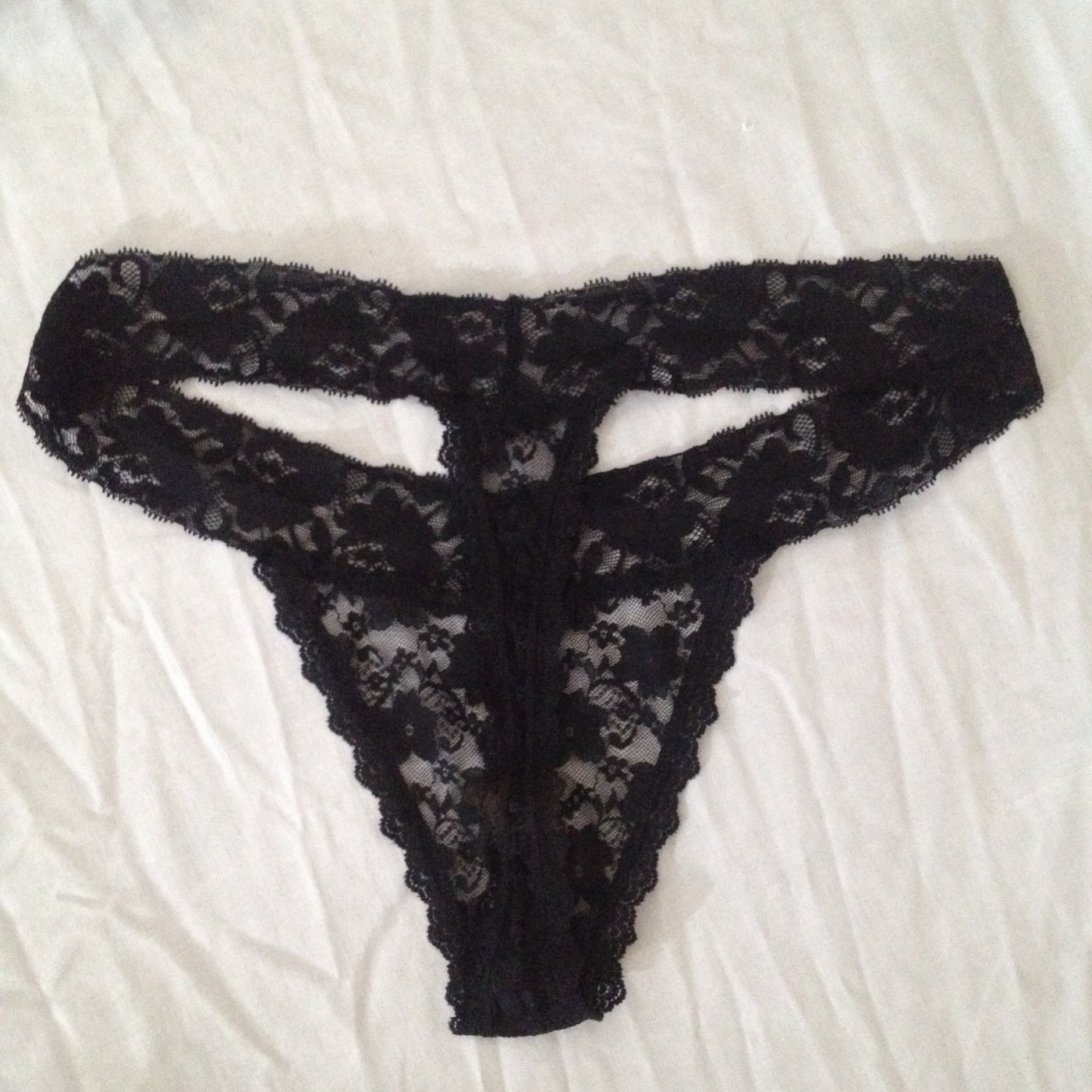 Lovely black lace thong, worn for 3 days consecutively. I've worn this pair to work, before and after sex, as well as to a fetish event, where everyone could admire my ass ;)