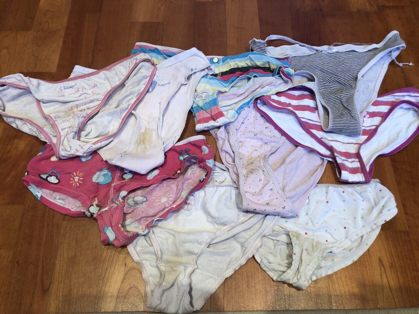 Son las braguitas que usaba de pequeña. Están muy sucias y rotas porque me las ponía días seguidos. Algunas están meadas y conservan su olor. Si quieres me las puedo poner antes de mandarlas para que así huelan aún más :) ❤️🔥
