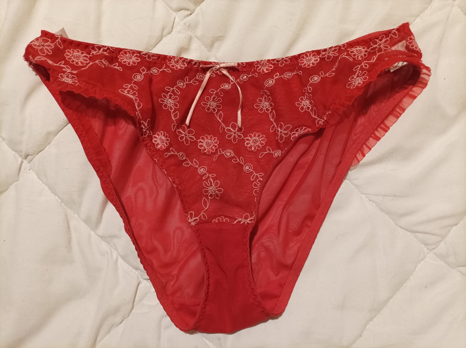 Cela fait un moment que je pense à cette solution pour assouvir mon fantasme et je vous ai donc préparé une surprise de choix pour l'occasion. Cette culotte rouge, qui est la mienne depuis quelques mois, je l'ai porté durant toute la semaine dernière en pensant à celui qui en deviendra propriétaire.