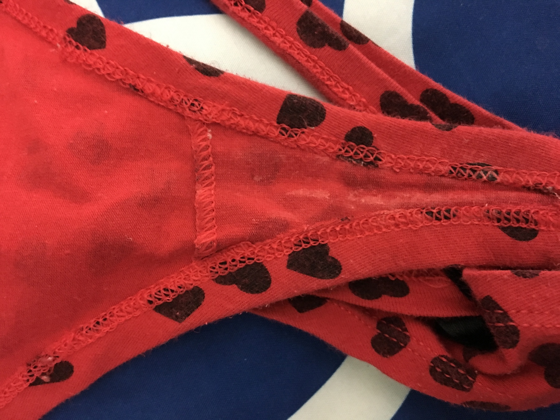 This is one of my fav pairs I have been wearing for years never been washed almost like a virgin panty 100 percent cotton please take them home and have a good sniff