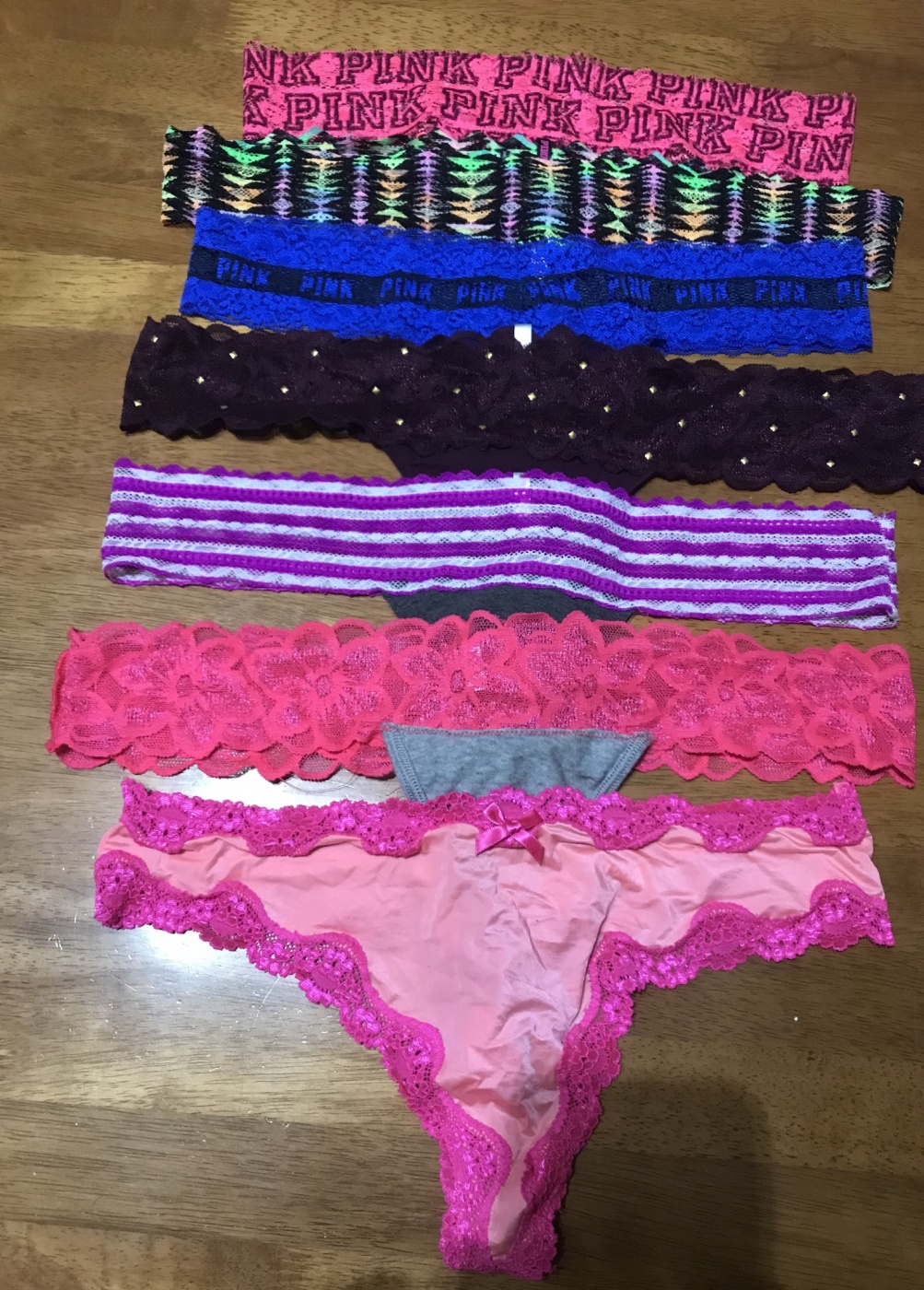 Collection of Victoria’s Secret panties available, you choose which pair you want me to wear. Panties with 24 hour wear, shipping (within US), and 5-10 photos (including face) are included in $20 base price. Special extra requests (masturbation, gym, stuffing inside, etc) are an additional cost.