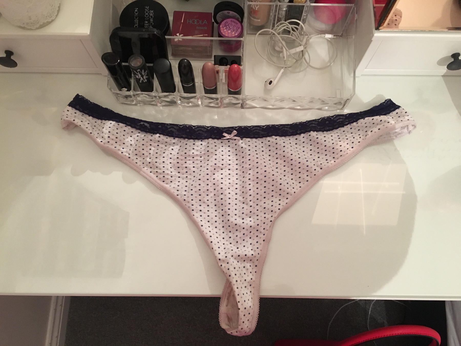 wore for 24 hours. white thong with blue spots and blue lace. masturbated with these on.