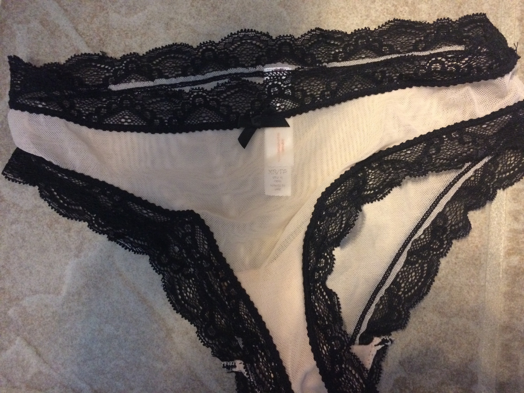 Nude see through bikini underwear with black lace trim. I wore these for two days during both masturbation and sex. My *** is all over the inside...I had a lot of fun in these panties. ❤