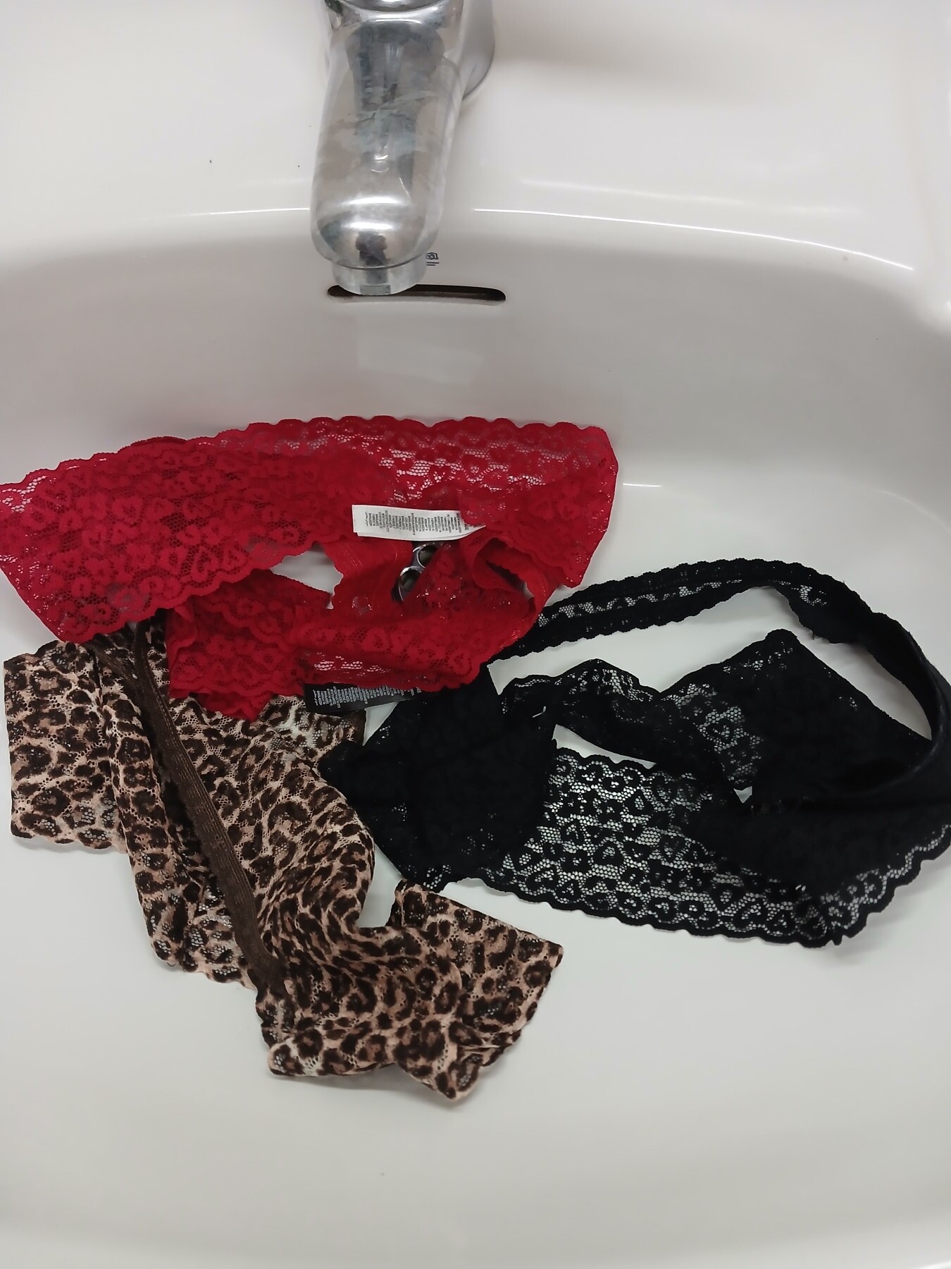 Pack de 3 tangas, puestas un día, sucias, solo 20 euros. Los envío envasados al vacío, el negro usado an masturbación, el rojo en una noche especial y el de tigre usado en días de mucha masturbación.