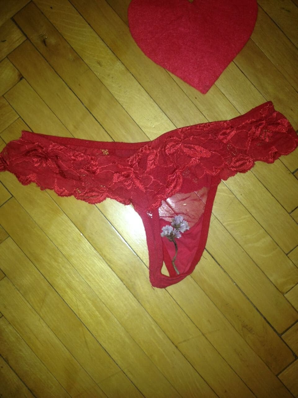 beautiful red lace thong, my favorite panties in which I did something. There is something left on the panties that you can see) They sit very nicely and look on the body from the side