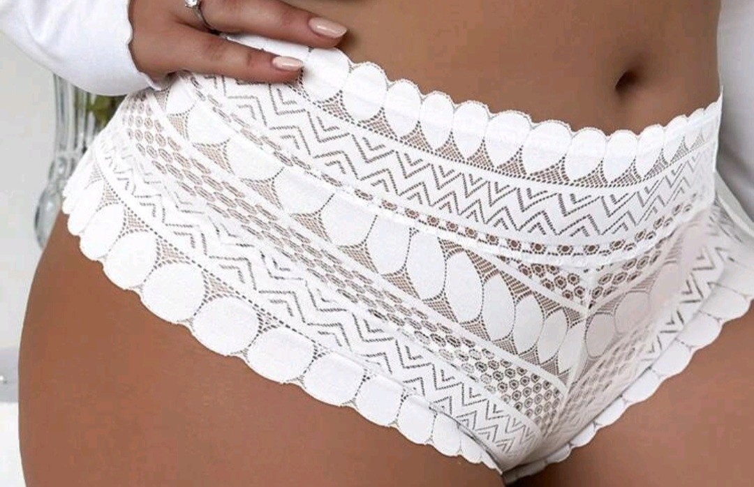 Un encaje suave, blanco , super comodo y agradable al tacto, me encantan estas bragas para estar agustico en mi casa