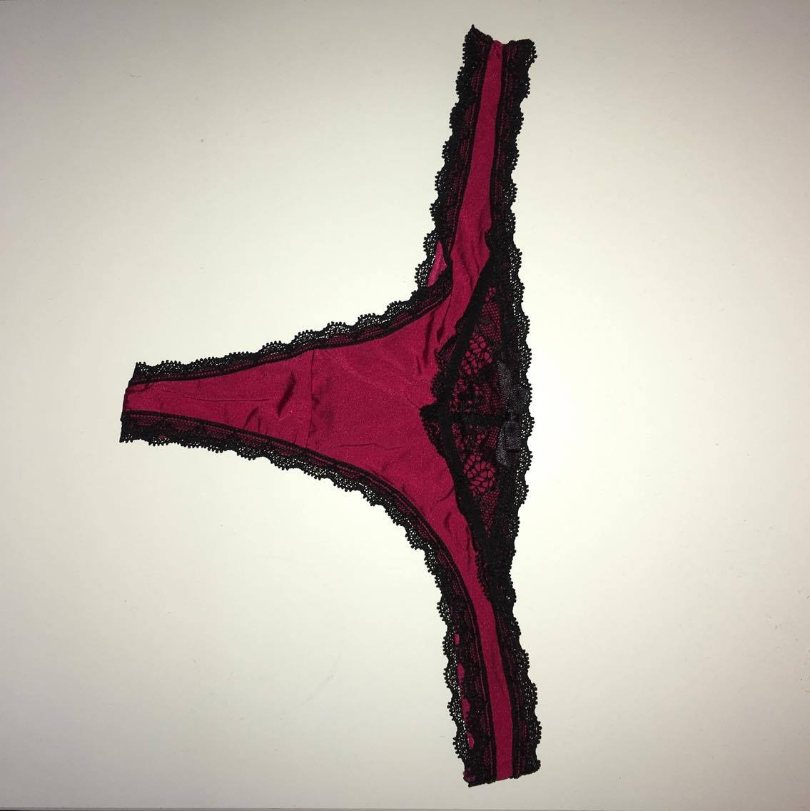 Cute red thong with black lace. Worn for 2 days, gone cycling and went to the gym.