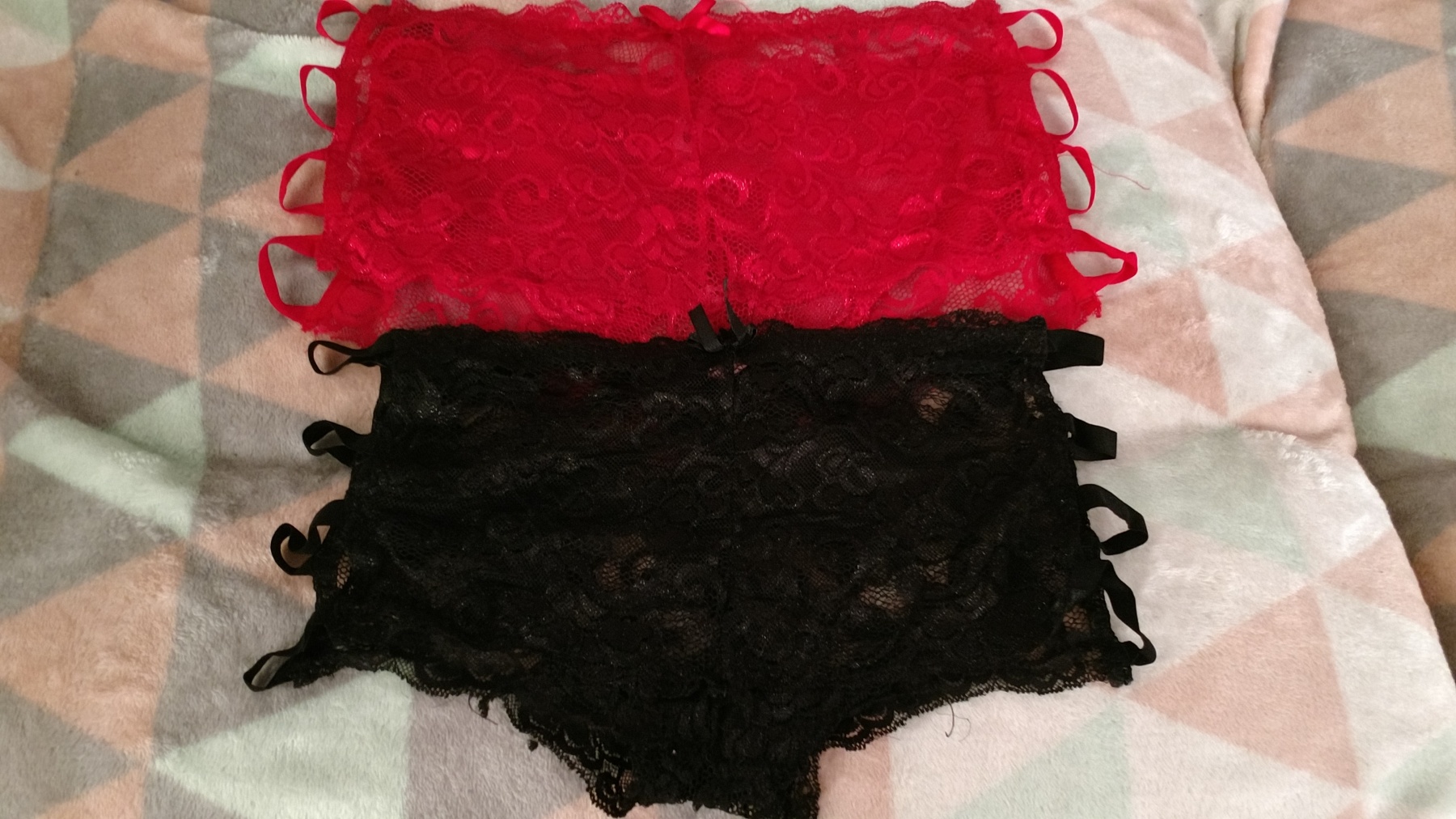 I have these two pair of sexy panties, with elastic that hugs my hips. The red is a large and the black is a medium. The price includes 24 hour wear + masturbation for no extra charge and shipping within the USA. (Priority Shipping) Always vacuum-sealed to maintain wetness for your pleasure. Let me know what else I can do in these for you and we can work out a price!
