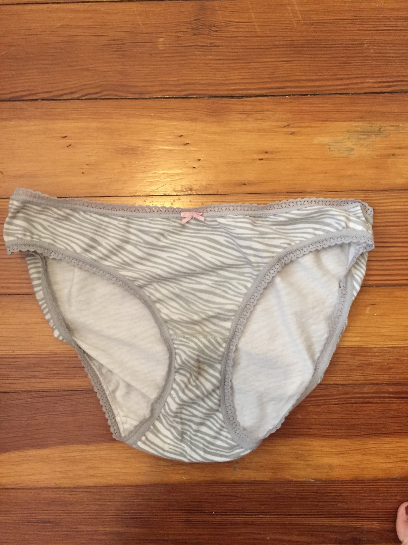 white and grey zebra print panties, lace trim and a pink bow. size small. worn for 3 days. small stain in crotch from use