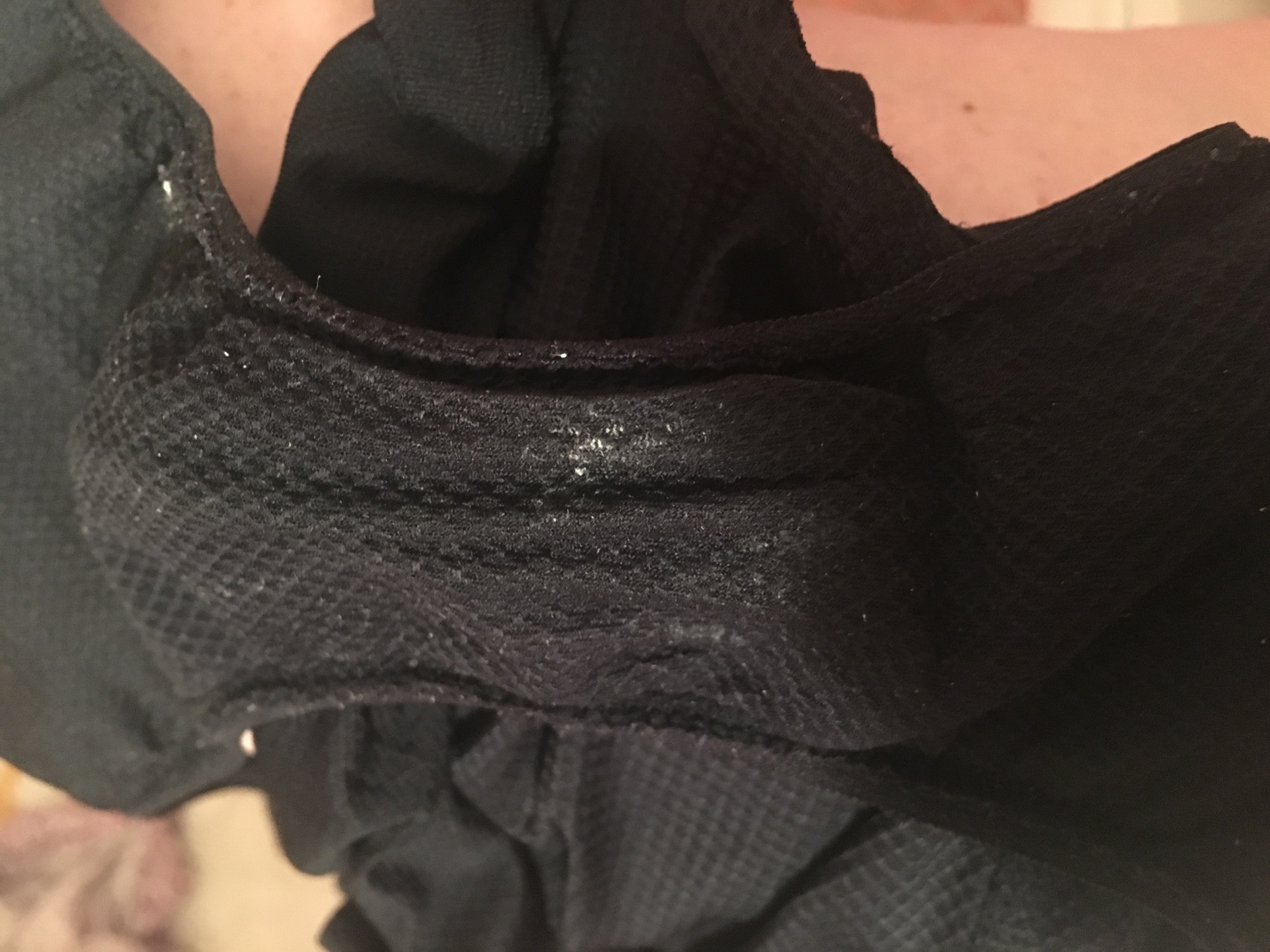 These black panties are super comfortable for working out in, which I did do earlier with a good sweat and thigh rub going on! They're part polyester, Lycra/spandex. I was in them all day at work, the gym, a self-finger session, and just chilling on the couch in just the undies and a tshirt. I'm a big girl and the scent is noticeable from my fingers as I sit here. Picture of some white stuff I found in them for you or maybe next time? The actual panty shot are in my profile picture.