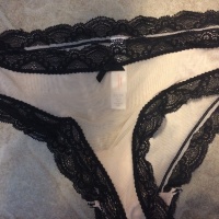Nude see through bikini underwear with black lace trim. I wore these for two days during both masturbation and sex. My *** is all over the inside...I had a lot of fun in these panties. ❤