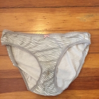 white and grey zebra print panties, lace trim and a pink bow. size small. worn for 3 days. small stain in crotch from use