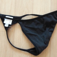 Black thong. Super comfy and I definitly masturbate in this one ;) Worn two days and one night. If you want I can wear it again for you ;) If you want something extra or more Fotos just message me :)