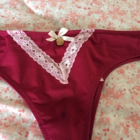 A beautiful maroon pantie, with a very delicate pink lace. Added with a Perl colored bow ❤️ Worn for 2 days and soaked in the sweetest ***** juice just wanting a little more love.