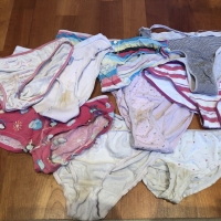 Son las braguitas que usaba de pequeña. Están muy sucias y rotas porque me las ponía días seguidos. Algunas están meadas y conservan su olor. Si quieres me las puedo poner antes de mandarlas para que así huelan aún más :) ❤️🔥