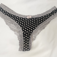 Black and white polka dot thong with sheer lace back. Can be worn for requested amount of time. Packaged discreetly.