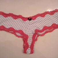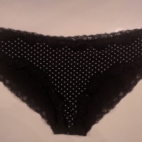 You choose the color, I will wear one pair for you for 24 hours. Message or Email for questions: [email] Click my profile and Shop to see the other panties. Colors: Black with White dots and lace (cheekies), blue with white lace (cheekies), Black with black lace and white dot…